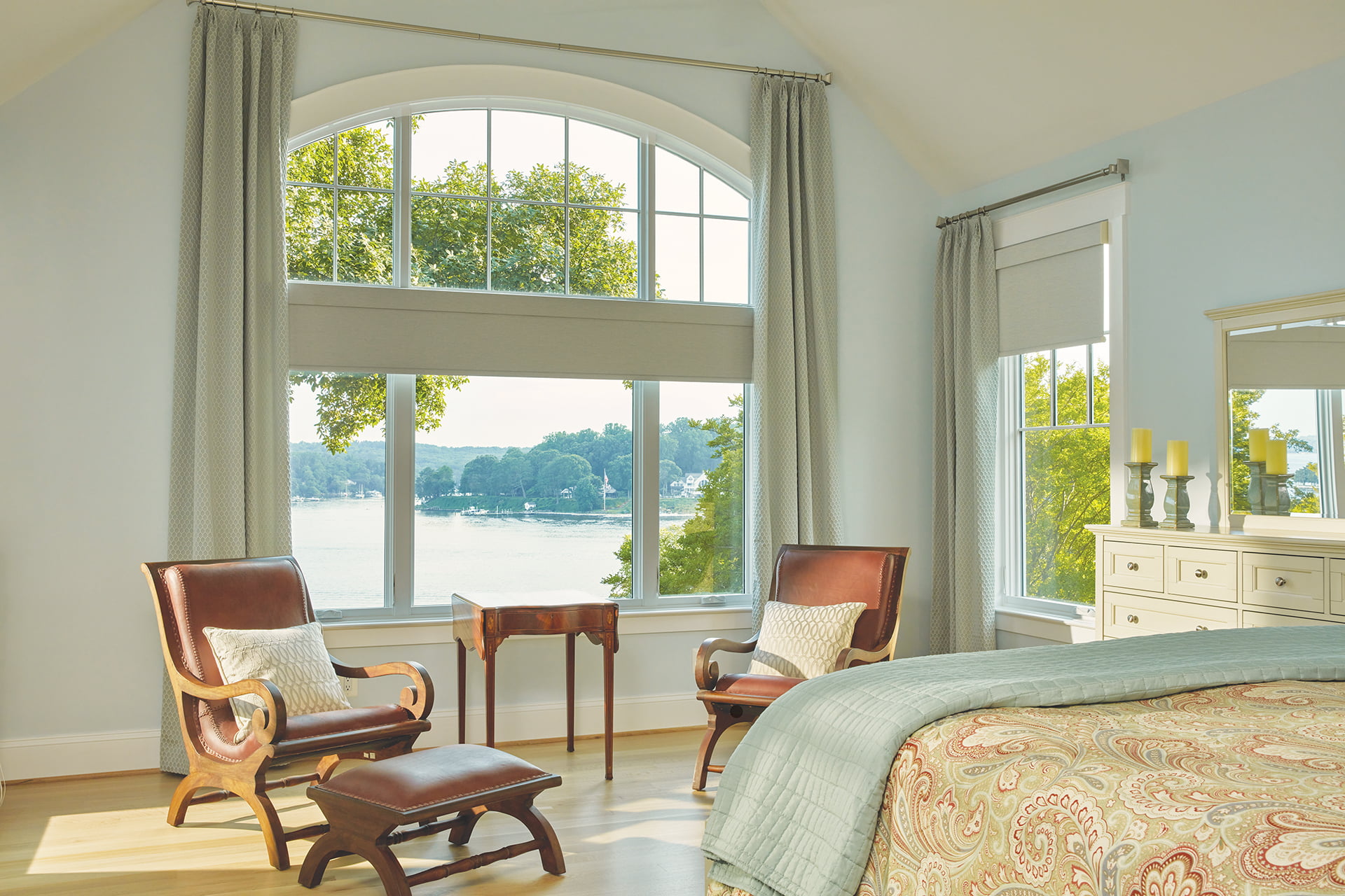 Most of the furnishings are from Lexington Home Brands in North Carolina, save for occasional antiques and favorite pieces the couple already owned. Window treatments were kept to a minimum to preserve the views.