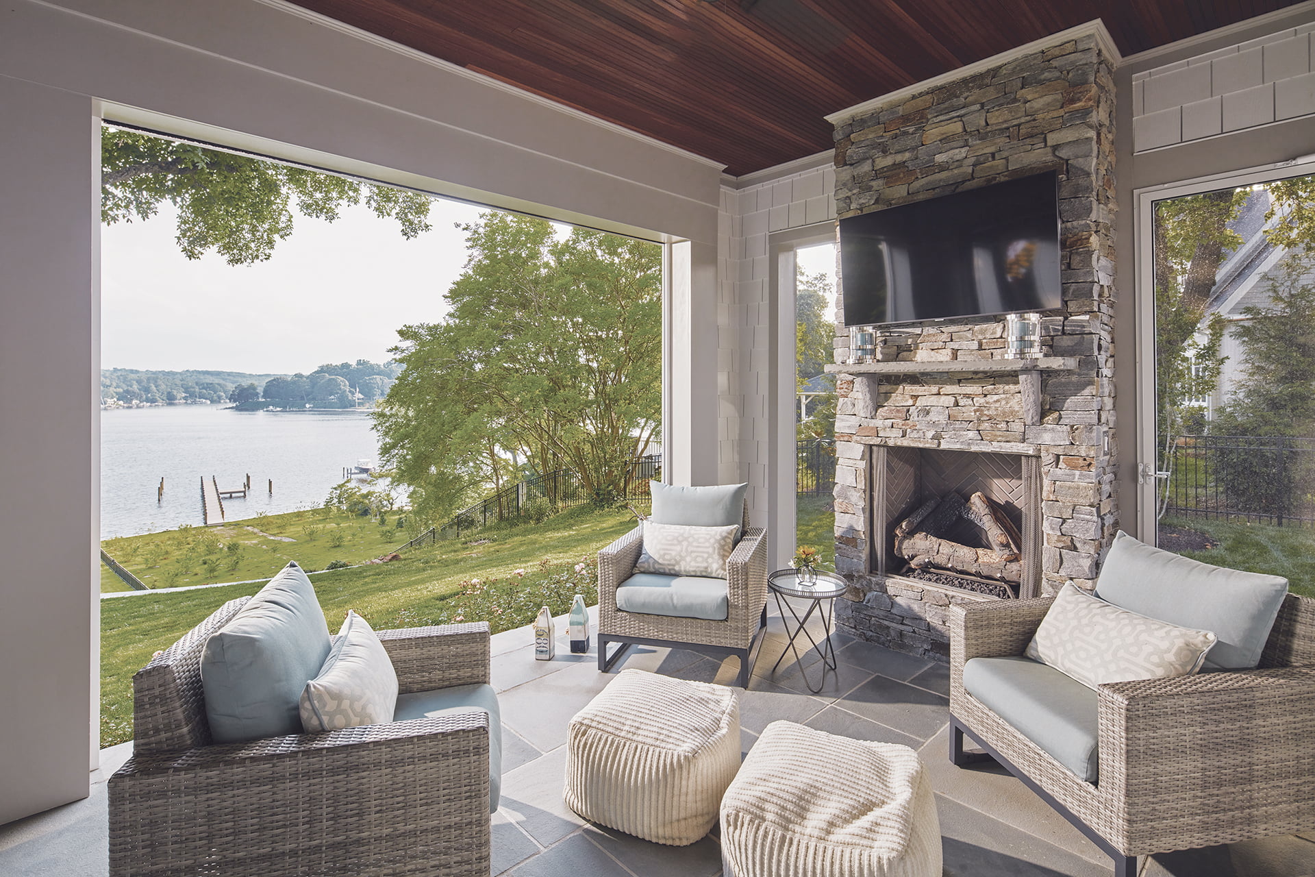 Hansen designed the home with two main-floor focal points: The distant sweeping curves of the Severn snaking past lush woodland on both banks, and a wide, welcoming covered rear porch running the length of the 42-foot-long great room. Retractable electric screens that repel the region’s pesky warm-weather bugs vanish into the porch’s top beams for critter-free outdoor living the rest of the year.