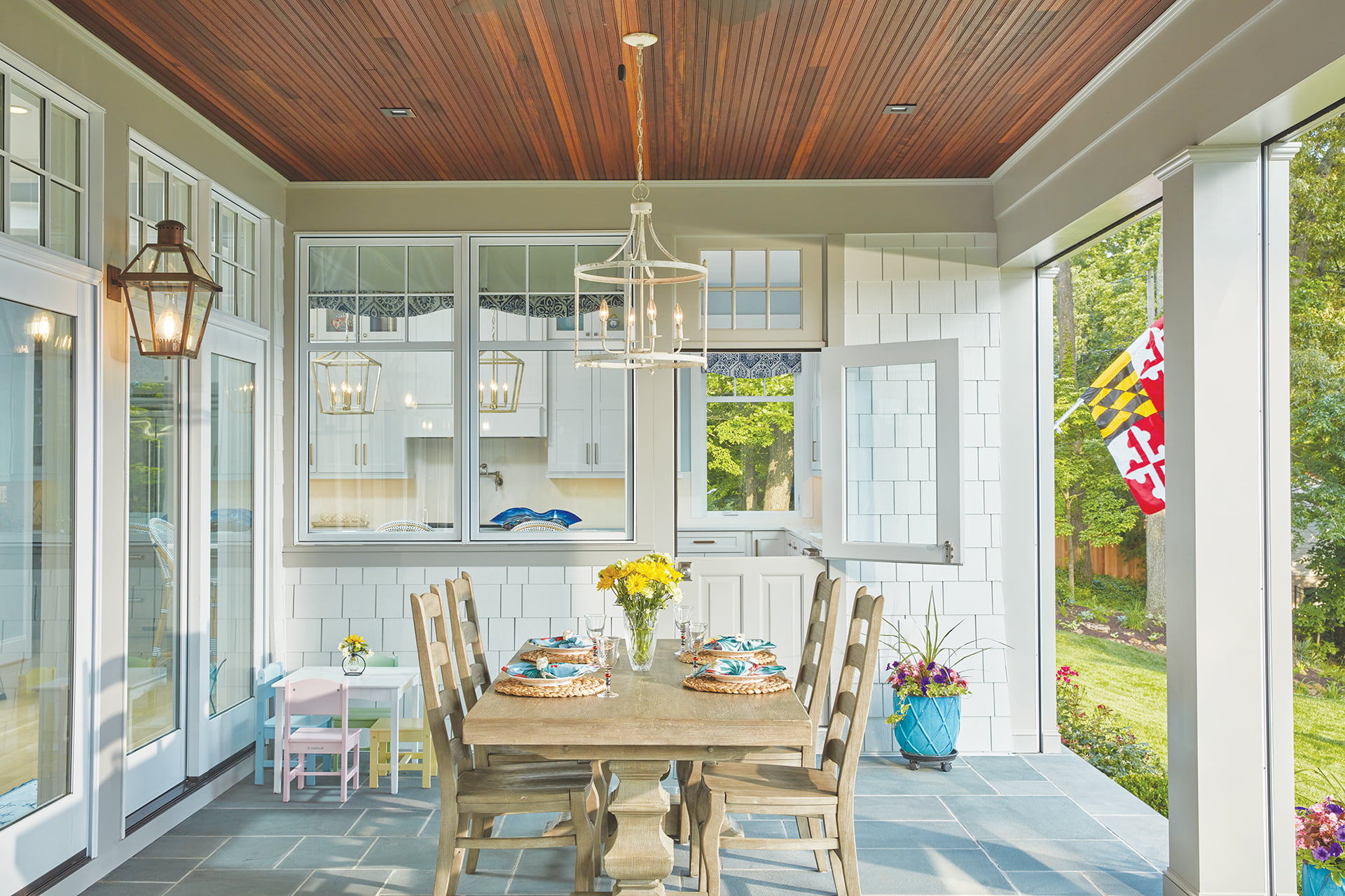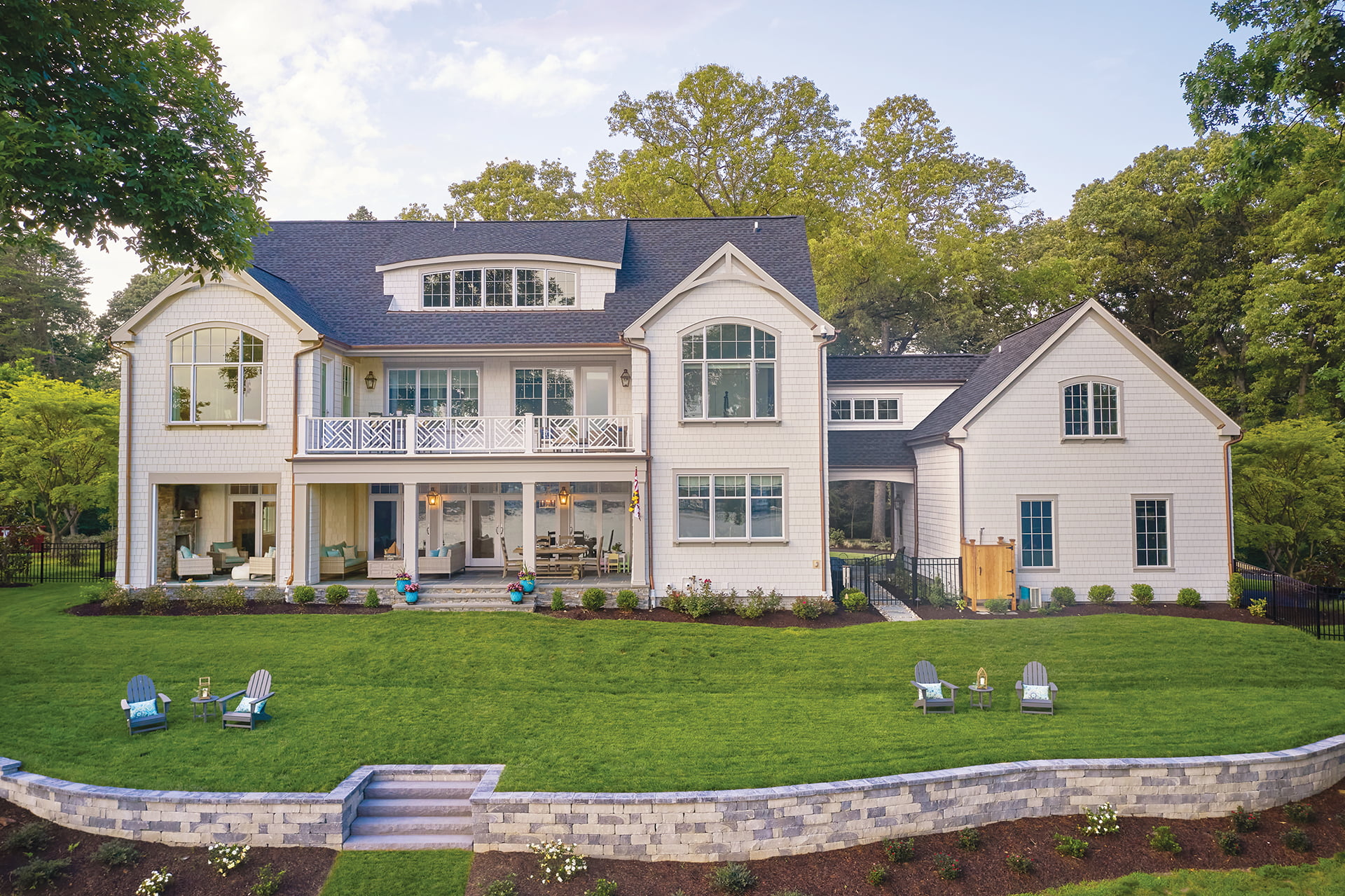 Doors in the kitchen and great room open to the rear porch, where furniture groupings and a tall fieldstone fireplace roughly parallel seating vignettes and the smaller, formal mantelpiece indoors. Hansen left space between the garage and the home directly under the second-floor breezeway to break up the long streetside structure and to catch the Severn breezes while grilling outdoors.