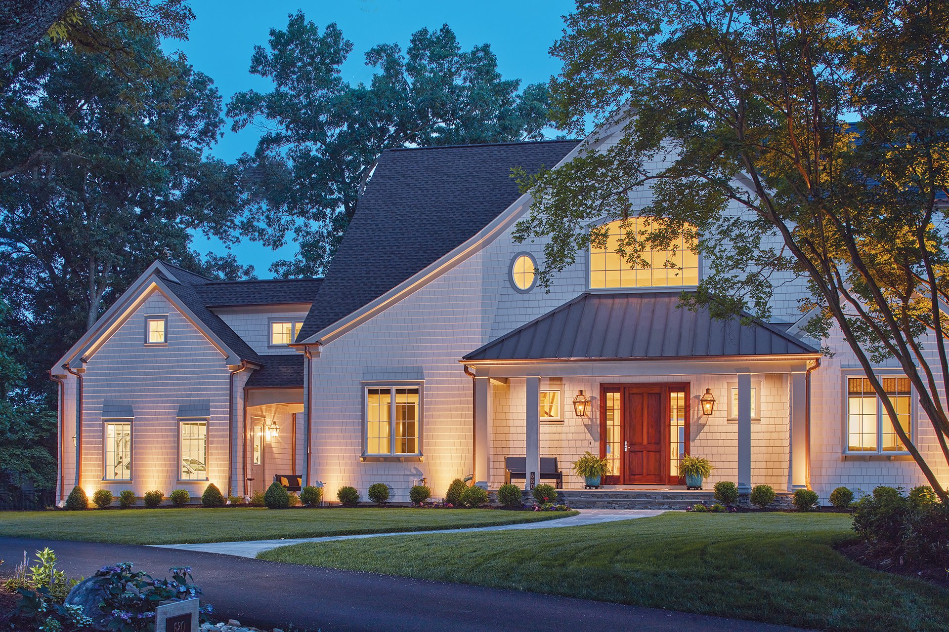 In 2022, after a year of pandemic-era construction, the architect delivered the Kostkowskis’ 7,565-square-foot retreat, beautifully sited atop the tract with prime river frontage. “It’s a Shingle-style Tudor/Arts and Crafts” home, which, given its size, says Hansen, “is almost like a cottage on steroids.” Surrounded by majestic trees, the five-bedroom, four-and-a-half-bath residence evokes coastal New England style, but with easy-care cement-fiber shingles instead of high-upkeep cedar shakes. A trio of front gables, a large arched window and a smaller oval porthole add visual interest.