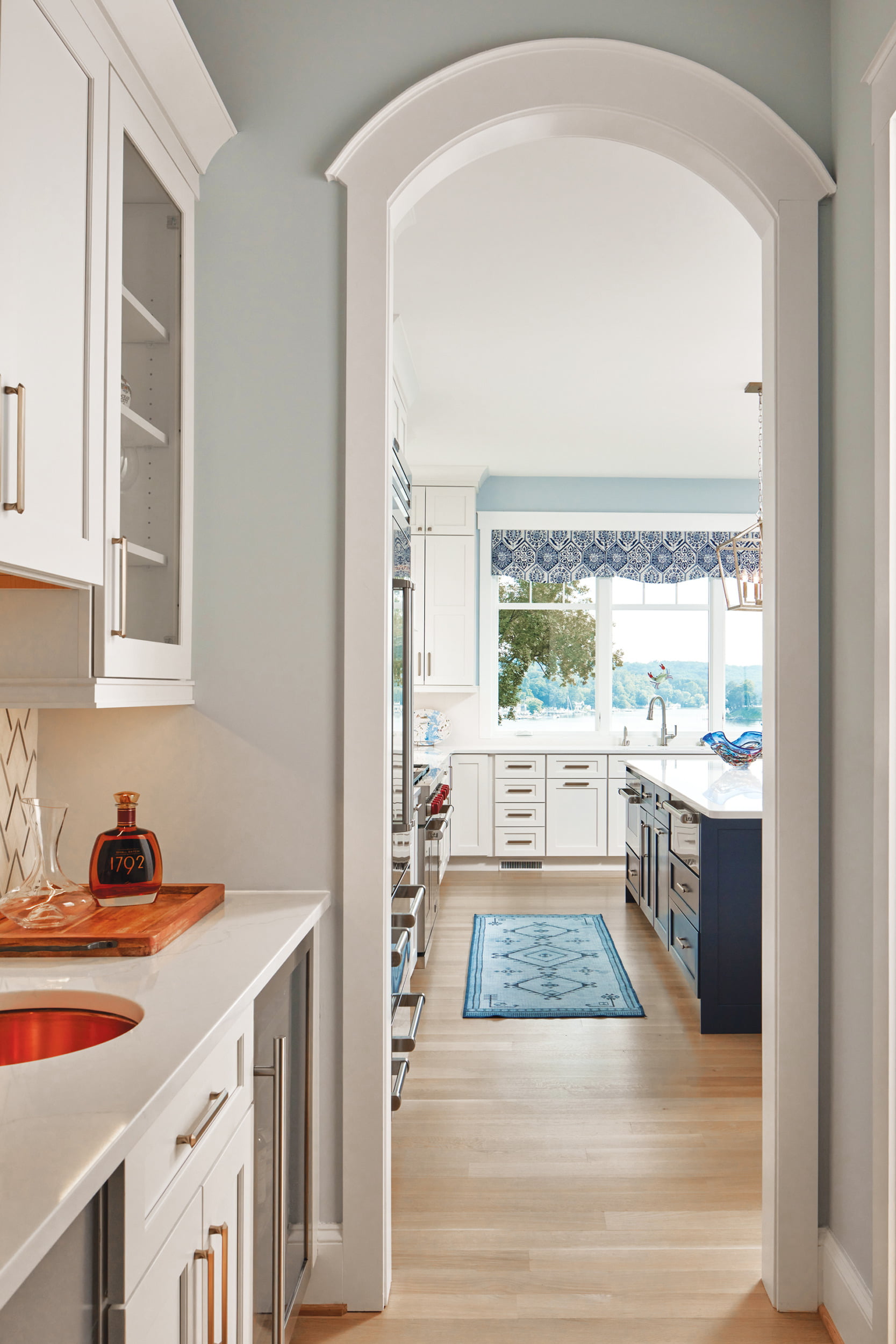 The center dining area is anchored by a long table and chairs, just steps from the chef’s kitchen on the left. A Wolf range and white upper and lower cabinets topped with white quartz line the kitchen’s perimeter. The large, deep-blue island was designed to accommodate sumptuous buffets. Since the Kostkowskis often host their children, two grandkids and extended family, the kitchen includes a wet bar and a walk-in pantry with extra ovens. Maria jokes that even washing dishes is now a pleasure because the window above the sink overlooks the river.