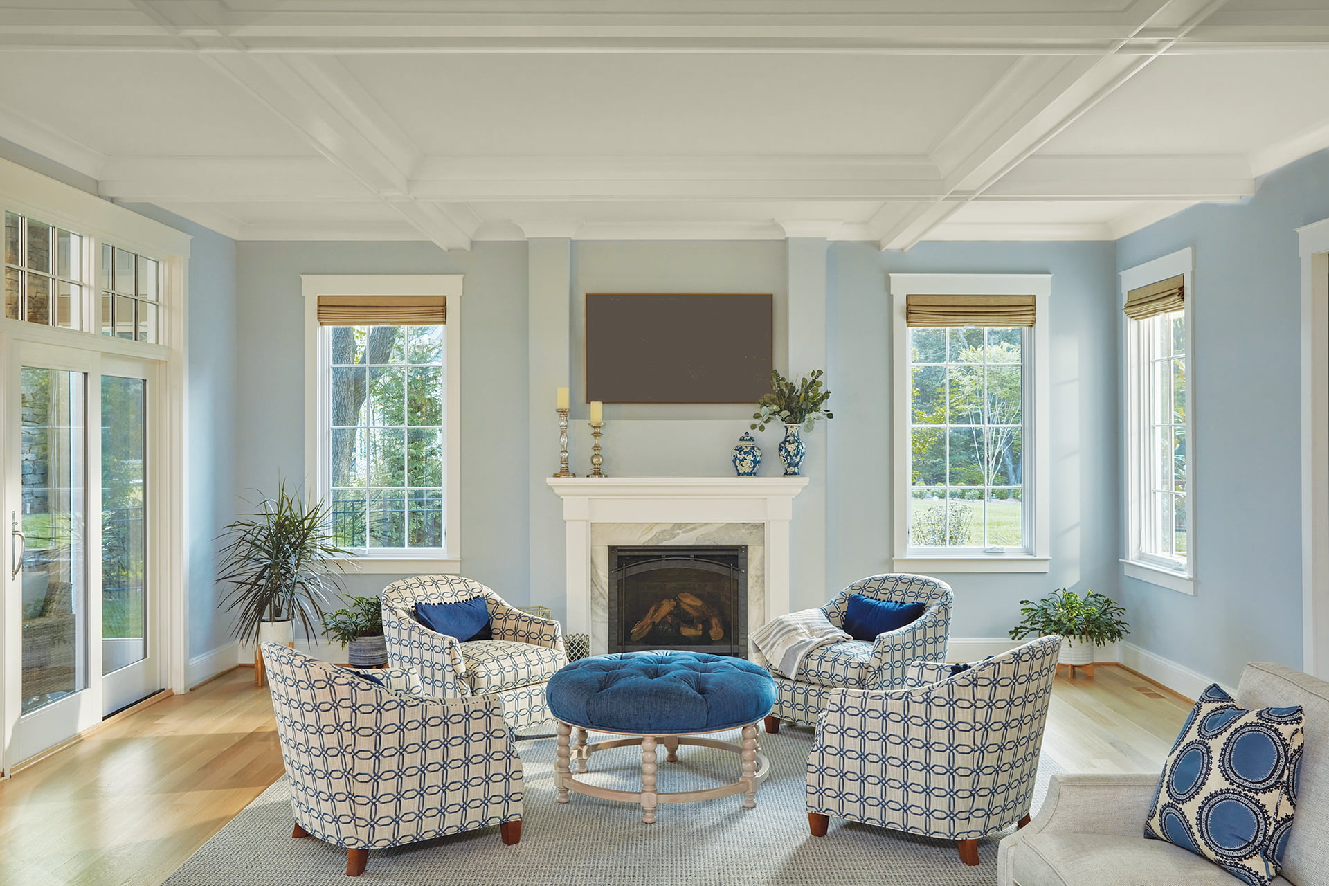 In one of two inviting seating areas in the coffered great room, furniture is upholstered in soft, indoor-outdoor fabrics that can withstand crowds, children and a frisky dog.